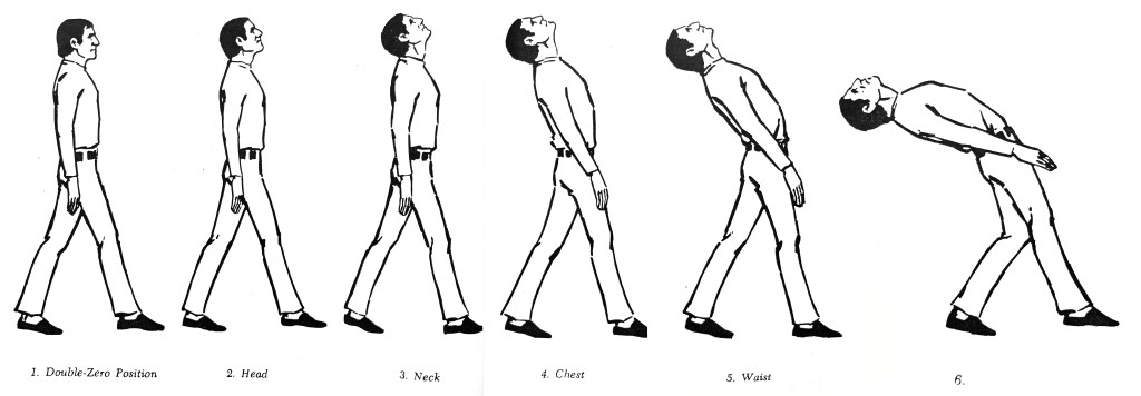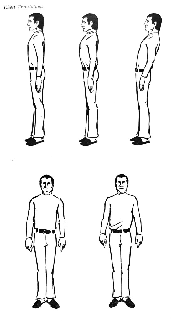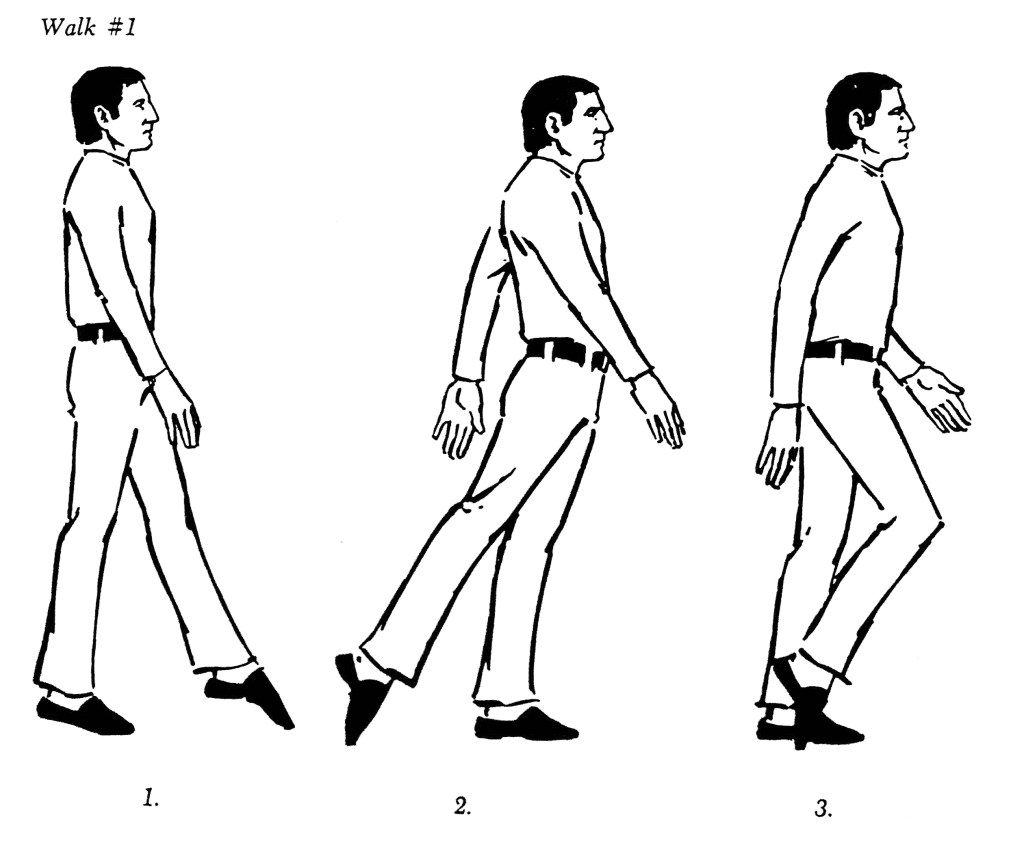 Now let’s combine a couple of these and see what kind of characters they make: Transtation the head forward; keep this, and transtation the chest forward. Now walk around: Get the feel of this character, and make up a walk that goes with him. Transtation the head to the rear, and the chest to the rear, and make up a walk for this character. Now try the head transtationed forward and the chest to the rear, and see how this character walks; and finally, transta. tion the head to the rear and the chest forward, and find a walk for this one. With all of these positions keep the head parallel to the floor, and be sure the chest is level.