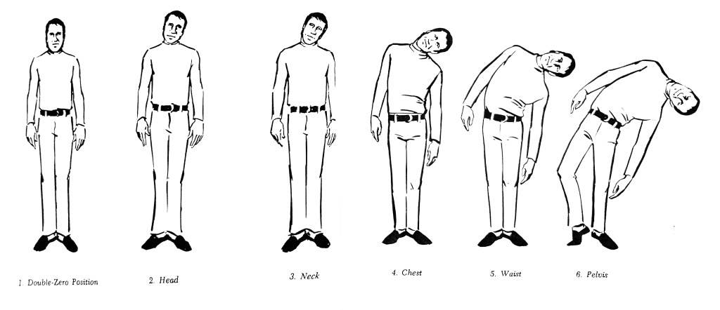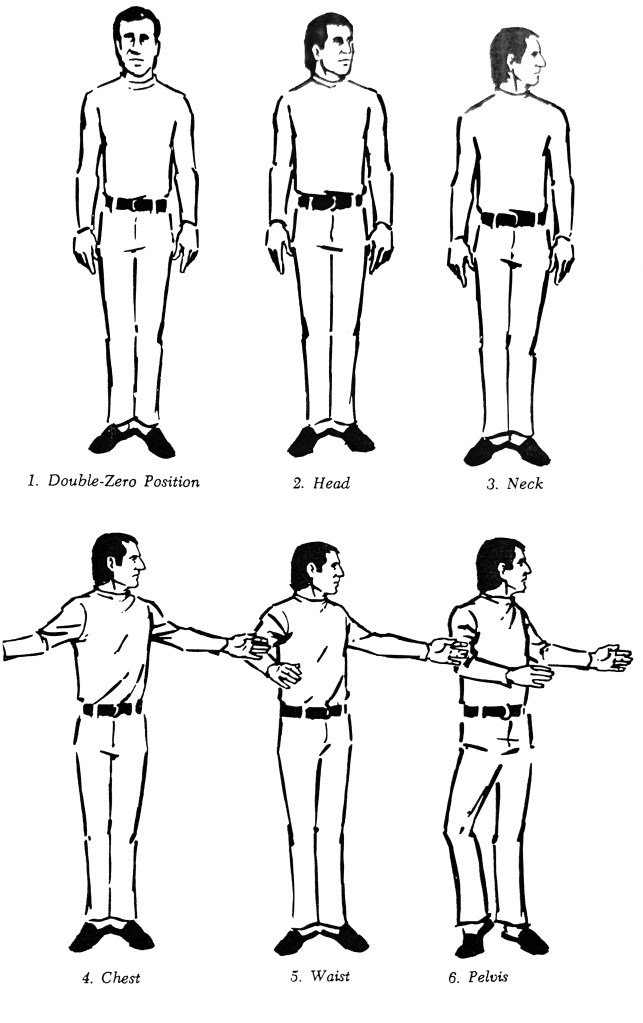 As a preparation for this, extend the arms out to each side as if you were hugging a giant barrel, keeping your hands below shoulder level Now let your arms drift up and down with the palms down, as if you were standing in water, and as if the water were offering resistance, so that your hands trail behind your arms: you break at the wrist, and your hands droop up as your arms come down, and the hands droop down as the arms drift up From now on, whenever you put your arms and hands down, let the hands trail a bit. Once again, start in the double-zero position, and turn the head to the left, keeping it vertical, until the big muscle on the right side of the neck starts to pull. Stop. Rotate the neck to the left as far as it will go, and keep the head turning. The head must be kept level. The head will usually be level when it feels like it is leaning toward the front of the room. Stop. Now turn the chest to the left, with the head still leading, pulling to the left. The instant the chest hits its final position in its turn, at the point where the waist would turn, stop the movement of the chest and allow its impact impulse to knock the arms into the air into an open position, as if the big barrel you were hugging is now a bit off to the left. Extend the hands as if you were reaching to shake hands. Stop. Twist the waist around to the left as far as it will go without turning the pelvis, and without changing the relationship between the arms and the chest. Stop. Now, to turn the pelvis, rotate it, and bend the right knee, go onto the half toe of the right foot, keeping the heel over the spot that it leaves. Keep the left hip in, and the entire body straight, level and vertical. Pull up higher, and be sure the head is still level. Now come back one piece at a time. Turn the pelvis back, straighten the knees and tuck the pelvis under try to lock it into position so that it doesn’t move; bring the, then rotate the ches ent with the waist and pelvis, and when it is in position let the arms fall to the sides (with the hands trailing), then rotate the neck back and then the head. You should be back in the double-zero position. Try it to the other side, and then repeat each side.