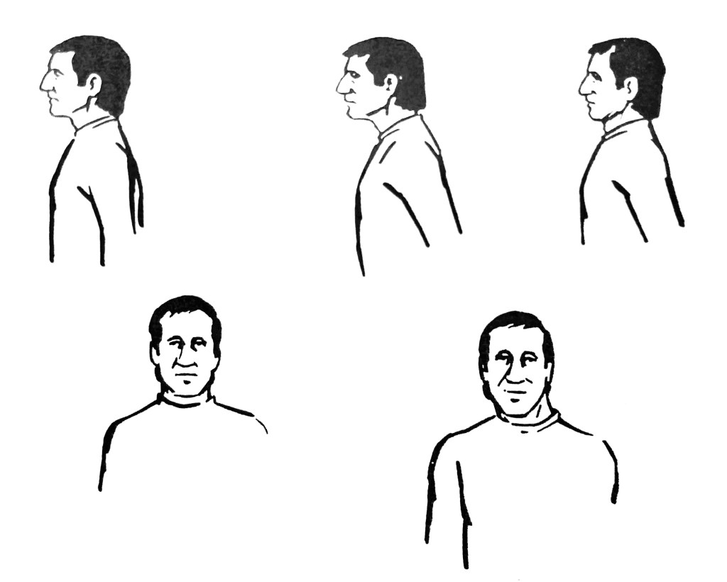 These are the only exercises that are best done at the mirror. Their purpose is only to stretch and make flexible the muscles in the face, not to practice any set expressions that should be used. There is no set way to display any emotion, but a mobile face will project what you are really feeling more clearly and strongly than an inflexible one. First, raise the eyebrows as high as you can, and then lower them as low as possible. Keep going up and down, letting the movement get faster. Next open the mouth as wide as possible, then close it, then open it as long as possible, then close it, and keep alternating wide and long. Then rotate your closed lips around and around in a chewing motion, and do it in the other direction. Now open the eyes as wide as possible and look up, then down, then alternate several times. Then look to the right, to the left, and alternate. Look to the right, fix on a point, turn your head to it. Look back to your own eyes in the mirror, then bring the head back. Do this to the other side.