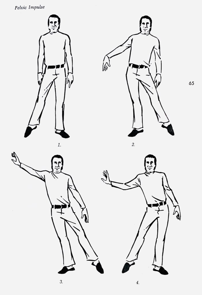 Whenever possible, the impulse for the action should come from the pelvis, flow through the chest, and then reach the extremities. It makes the action even bigger and clearer than just the chest impulse. Point the right toe to the side, knee straight. As you shift the weight to the right leg, put the heel down, and lead with the pelvis, then feel the flow up through the chest, allow the chest to lift the arm up as if it were going to pick an apple. All the weight is now on the right leg, and the arm is up in the air, both knees straight, the left toe pointed or on the half-toe. To come back: Put the left heel down, lead with the pelvis towards the left, then let it flow through the chest, which inclines to the right, pulling the arm down. Do it a few times on each side. Now do the same thing forward and back, shifting the weight forward, and flowing through the chest into the arms, and leading with the pelvis to come back. Now point the right toe forward. We are going to pick something up off the floor. Step forward onto the right, leading with the pelvis, lift the chest which lifts the arm, and as the arm comes up, bend the right knee, extending the left leg back, as we did in the body as a unit. Keep the body in line with the left leg: pick up the object. Now, to come up, the first move is to tuck the pelvis under hard, breaking the line of the body, and allow the momentum from this to lift your body. Do not start up until the pelvis has hit its final position in tucking under, and let this carry you. The body breaks in this: Don’t keep the body as a unit on the way up. Try this on the other side. You can use either hand with either leg forward. From now on, whenever you pick something up, tuck under a bit, and let the impulse from the pelvis lead you.