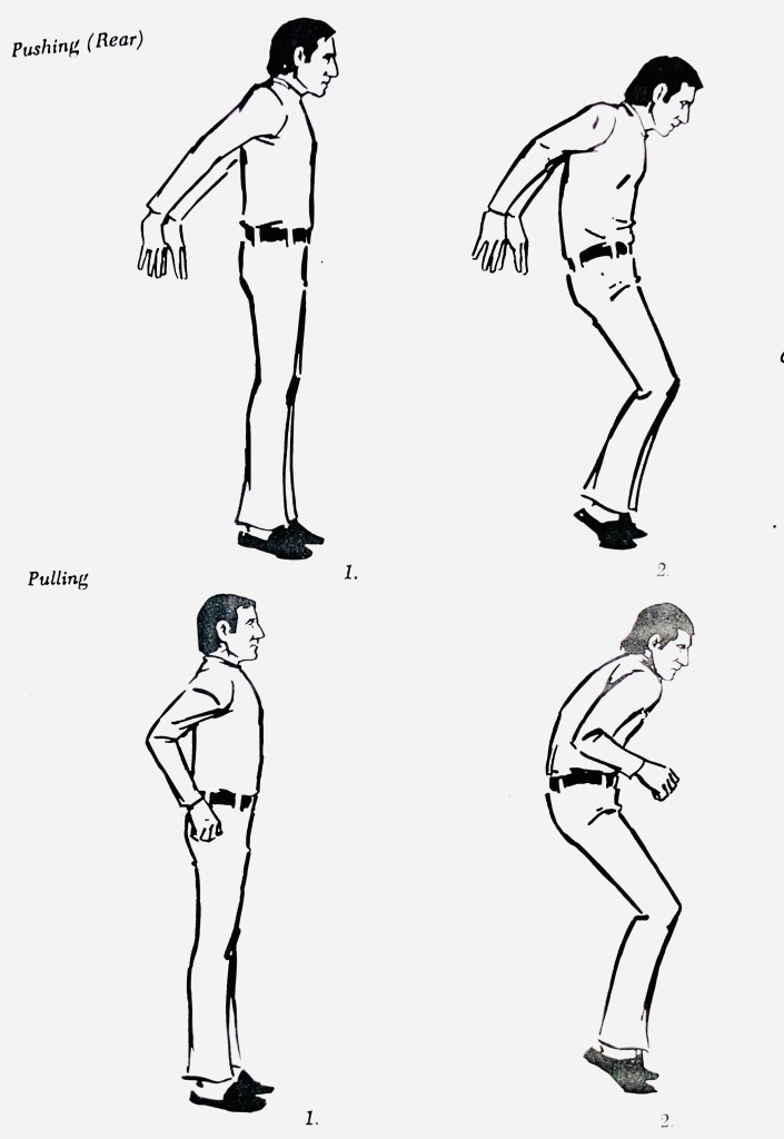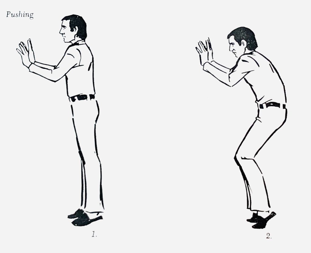 The impulse for all illusions of pushing and pulling comes from the pelvis. Imagine a large truck in front of you; you have to push it. Place your hands on it. Tuck your pelvis under as you bend your knees and go to the half-toe of both feet. Your shoulders go forward, since you are pushing forward. Try to keep your hands over the spot on the floor where they are, so that it will appear that the truck is not moving. Relax, and do it again several times, the last time letting the truck move so that you move forward. Use strength and energy. Now place the truck behind you. Put your hands down behind you against it. Push by tucking your pelvis under, going to the half-toe of both feet and bending the knees. This time the shoulders are behind the pelvis because you are going in that direction. It is exactly the same from the waist down: pelvis tucked under, knees bent, and on the half-toe. Now let the truck move. Now take hold of a stuck dresser drawer in front of you with both hands. Tuck the pelvis under, go to the half-toe, bend the knees, and pull the shoulders behind the pelvis in the direction of the thrust. The arms should straighten a bit as you do this to give the illusion that the drawer doesn’t move. Then let it come out. Try this same move with an imaginary rope in front of you. Now try pulling an imaginary rickshaw. Take hold of the handles, tuck under, go to the half-toe with the knees bent, and the shoulders go in front of the pelvis in the direction of the thrust. Do the motion a few times, and then pull the rickshaw. Try this with a rope over your shoulder. Apply this principle to a stuck window: Tuck under as you try to open it. Now lift a bar bell with the same principle: First tuck under and bend the knees as you go the half-toe, and then as you lift it, put your heels down and tuck under more.