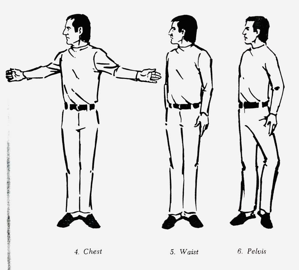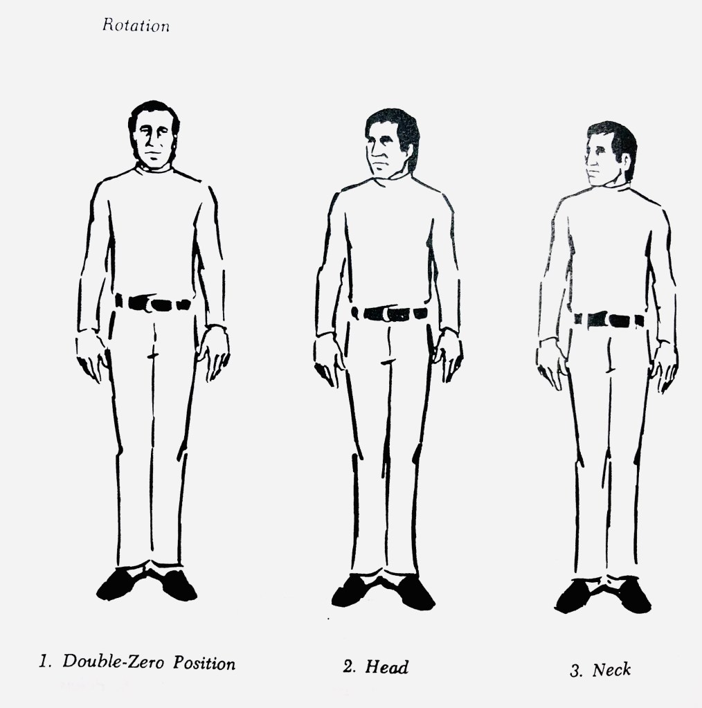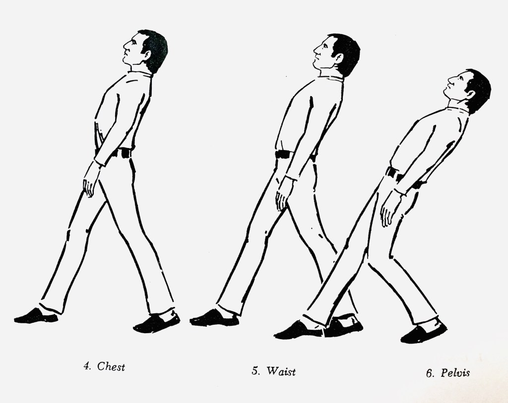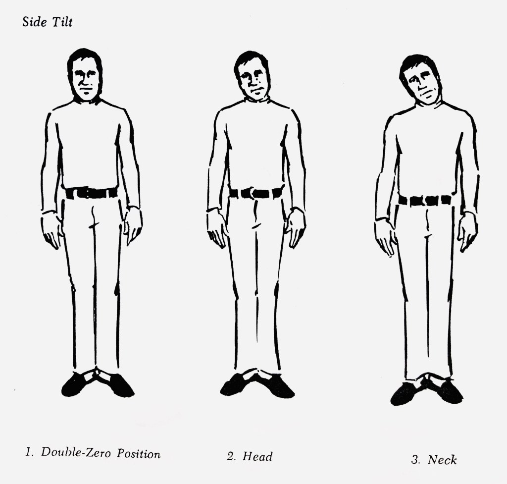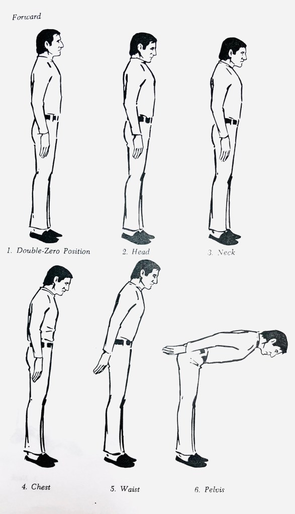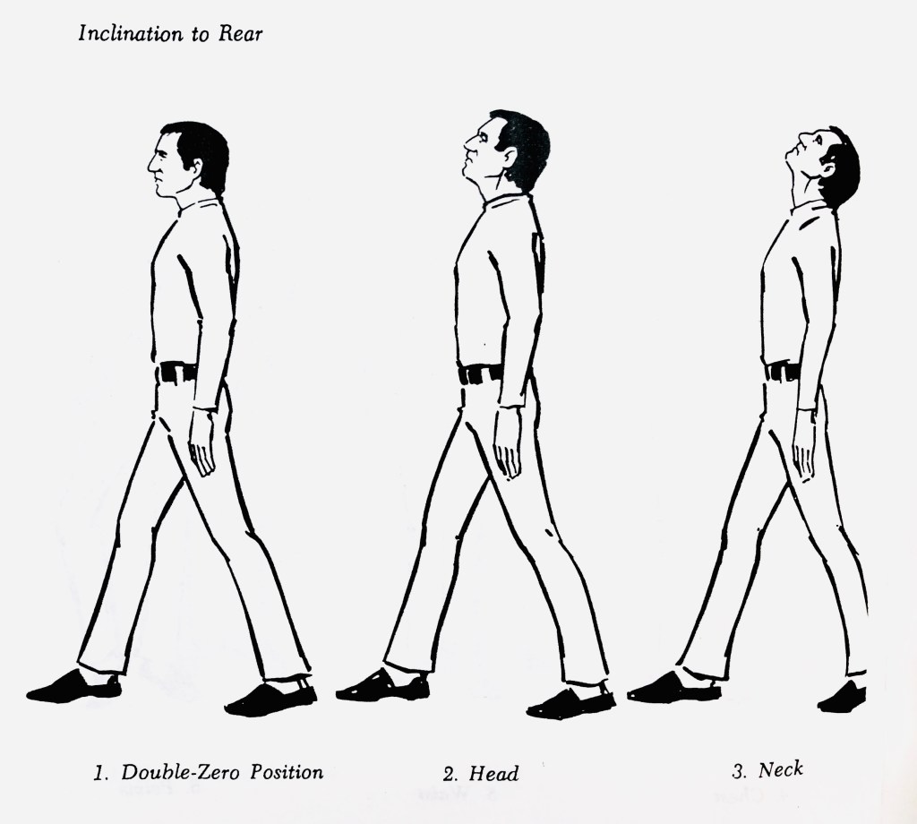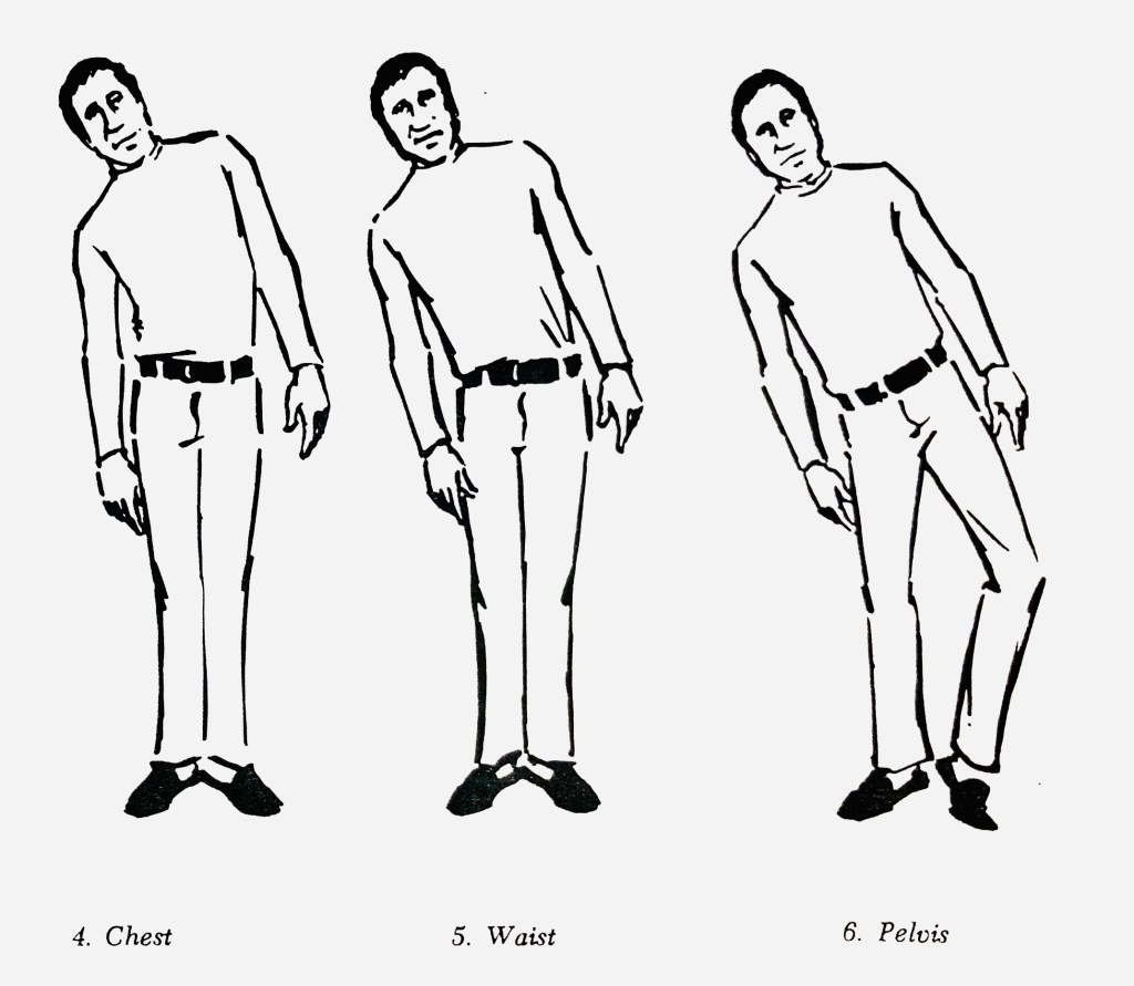 Start in the double-zero posi. tion, and incline the head forward. Bring it back to the center. Repeat this several times. Now, keeping the same angle between the head and neck, incline just the neck forward, and bring it back up. You will feel it pull at the back of the neck. Do this several times. Don’t let the head incline too far— keep it in line with the neck. Now incline the head forward, keep it there, and incline the neck forward: bring the neck up, and then the head. Now the chest: Incline it forward while keeping the head and neck in line with it, and then back to center, and do it several times. Then incline the head, then the neck, and then the chest forward, and then up in the usual manner: chest, then neck, then head. Now incline just the waist forward, keeping the head, neck and chest in line with it. Keep the pelvis tucked under. This should be like a little bow. Do it several times until you can really feel where the waist is. Then incline the head, neck, chest, and waist, forward, and come up one piece at a time. Now incline just the pelvis forward, breaking at the top of the leg, and letting the pelvis go back a bit, like a big bow. Now incline forward in the usual manner, one piece at a time, and then come up.