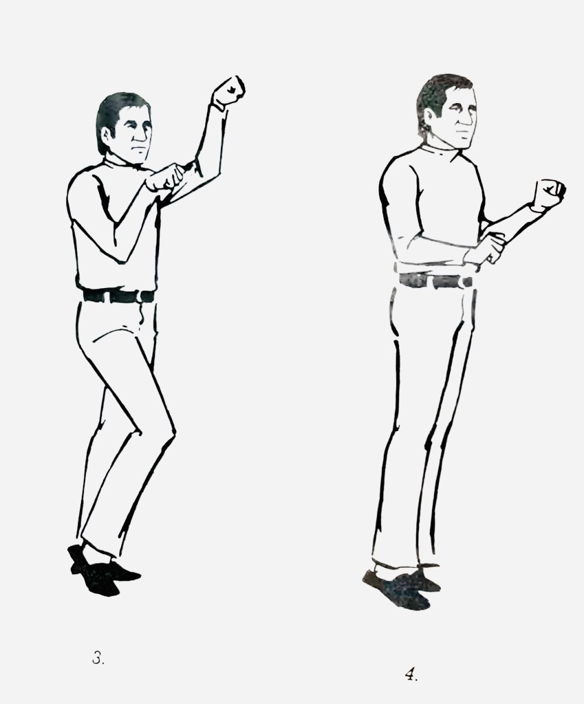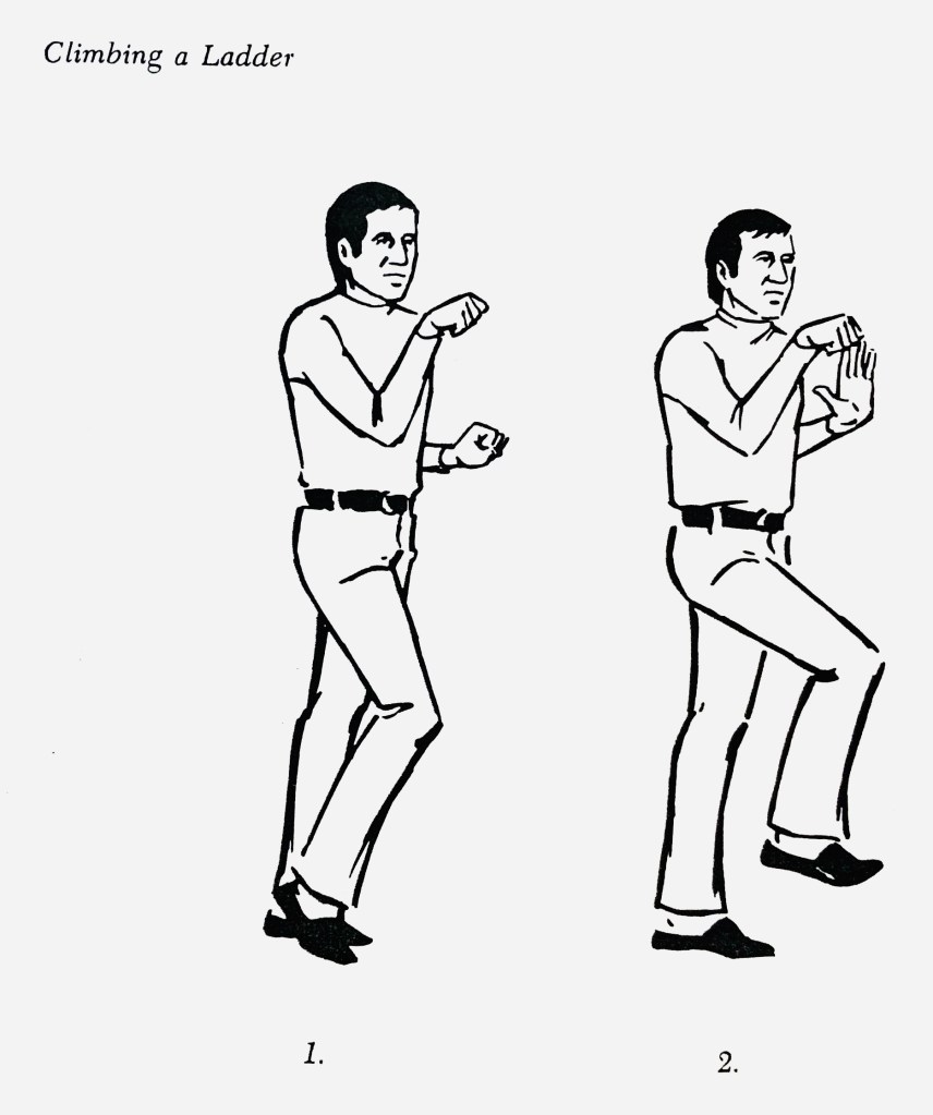 Lift your right foot into the air, as if you were going to put it on the next rung of a ladder, but since there is no ladder there, place the half-toe of the foot on the floor, next to the left foot—the right knee is now bent. As you do this, say to yourself, “Round, place." Next, rise up on the half-toe of both feet, straightening both knees, so you’re way up, and when you’ve reached the top, come down, bending the left knee, and going to the half-toe of the left foot. As you do this, say to yourself, “Climb." Now lift the left foot from the half-toe in a climbing movement, and then put it back on the half-toe, then rise up again, and then bend the right again. Keep doing this over and over until it’s familiar. The words for the hands and the legs are the same, and they coordinate that way.