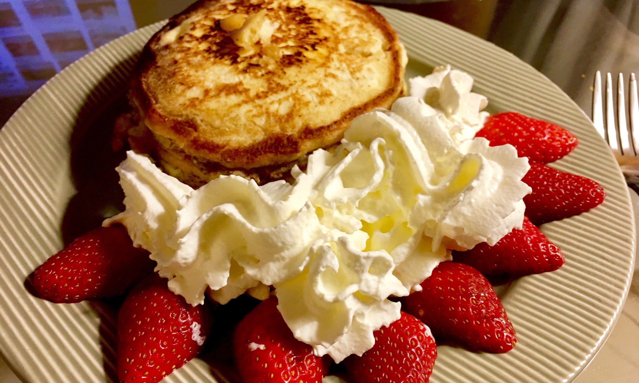 因為以往每次來香港總時身體燥熱到唇破流鼻血,但這次來實行的“肅清”計畫,似乎有了成效,今天已經是第六天了,皮膚的水份斯乎仍是充足的,並沒有燥熱跡象,果然食物對於調理身體很重要噎!雖然今天休息一天,但是肚子可是不休息的,剛好傍晚逛完每天都逛的超市後,隨手買了一盒草莓,就想說用草莓做一頓美麗的晚餐好像也不錯,於是看見一星期前就買的鬆餅粉,就隨意的攪和攪和!就這樣囉!