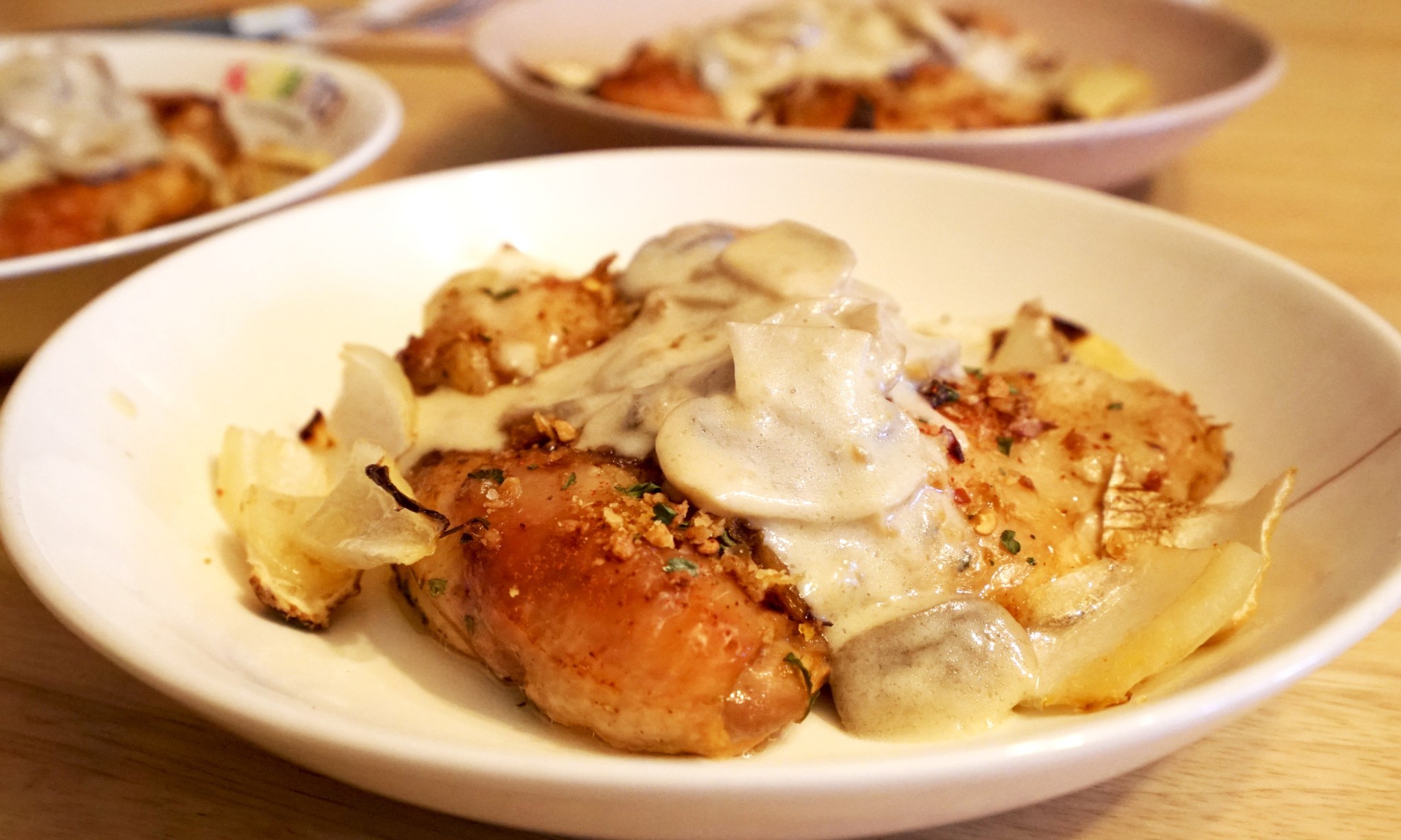 - 雞腿烤好後,裝盤,再將製作好的白醬淋上去,大功告成。