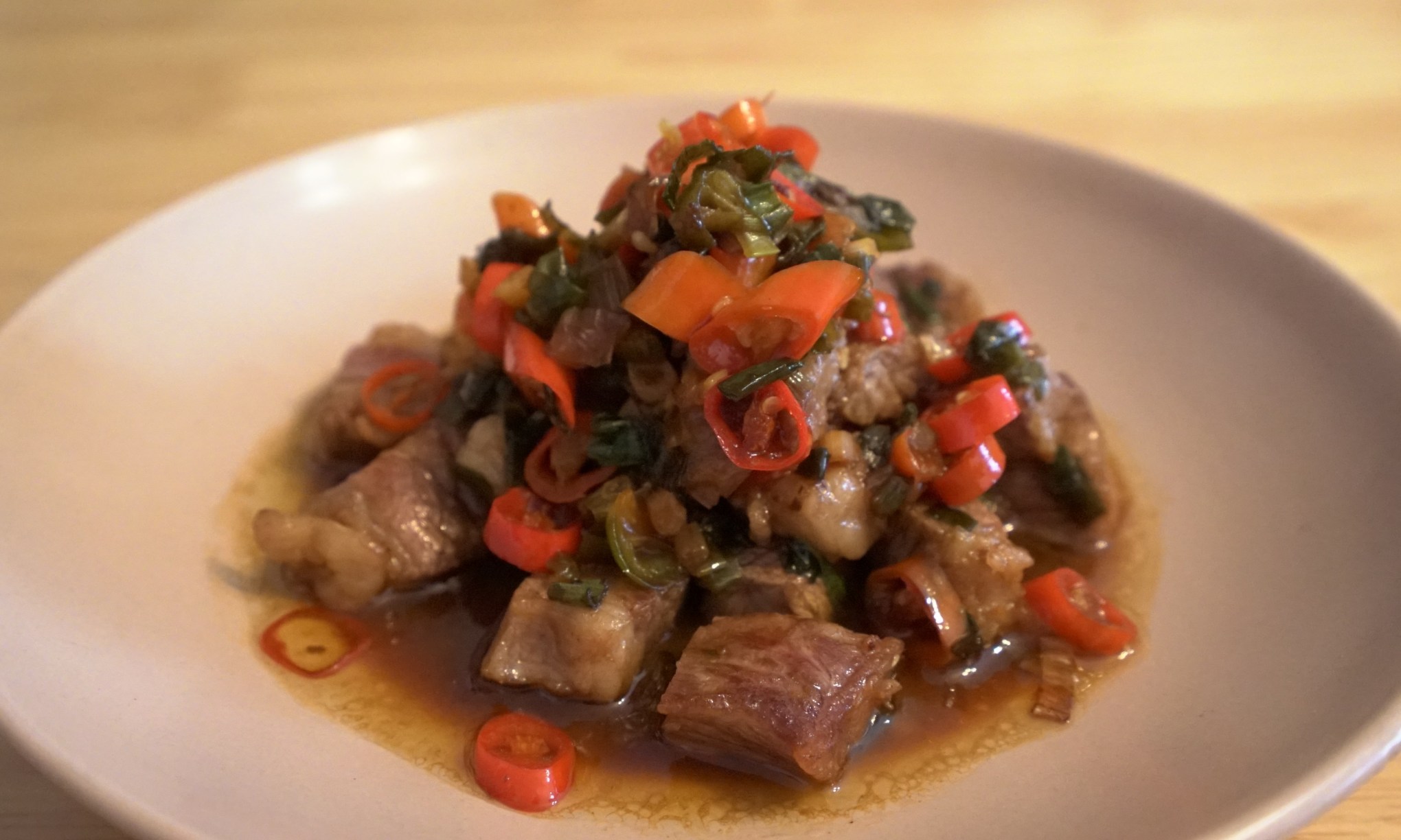 - 放入牛肉塊拌炒,加入一大匙的水,再加入半匙的柚子醋