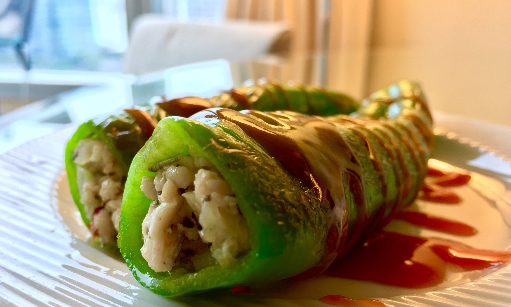 回飯店的路上,忍不住再次端詳了幾眼,心想:「哇咧!這怎料理啊?」心中充滿疑惑地回到了飯店,打開冰庫,看見一袋已經結冰的雞里肌肉,瞬時回到了多年前參加一個尾牙的場景,好像有那麼一道菜,是將肉末塞入這尖椒中的。因為肚子的飢餓感將我拉回現實,好!我就來試試看!但是當初多年前的味道其實已經遺失了!怎辦?