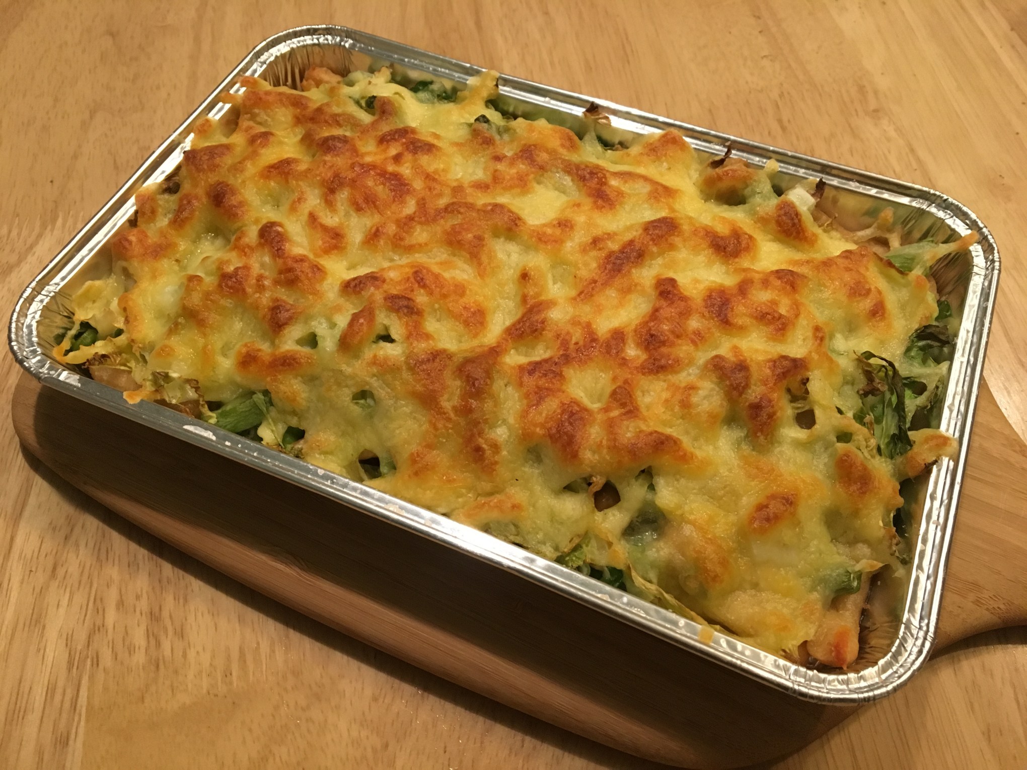 - 放入烤箱,前十分鐘:150度。後十分鐘:200度。烤至起司變金黃表皮微微焦咖啡色。