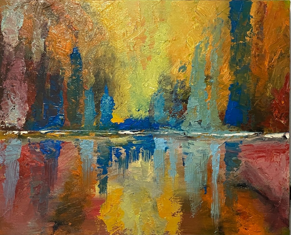 Il pleut légèrement dans la ville et les rues humides reflètent les couleurs du crépuscule.
